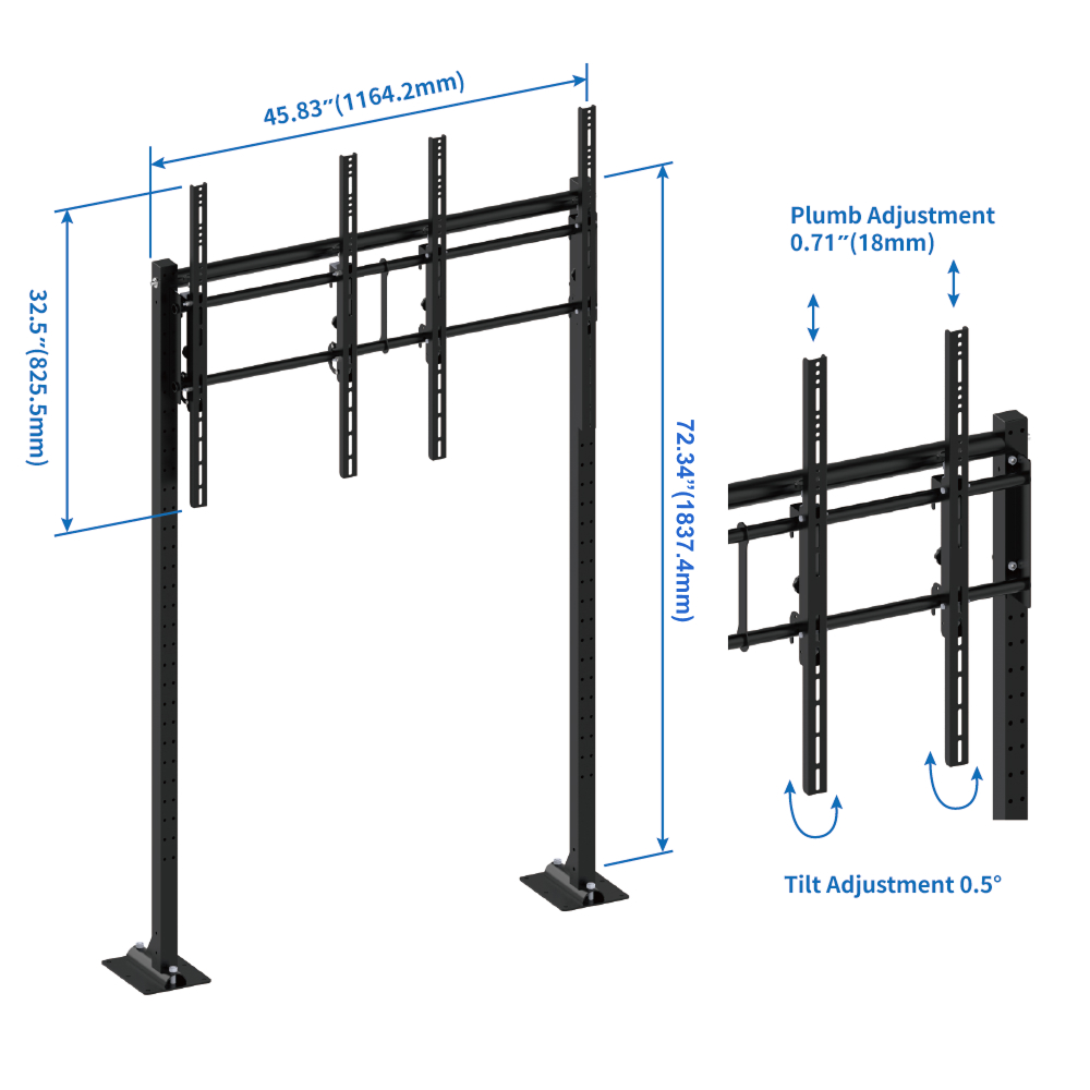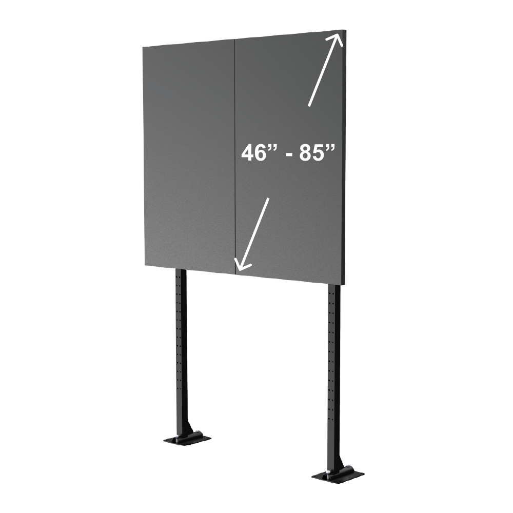 Experience the stability of a floor-mounted video wall setup, eliminating the need for wall mounts. The 2x1 Portrait configuration is designed for screens ranging from 46 to 85 inches, meeting VESA compatibility standards from 200x200 to 800x800. Achieve seamless display alignment with independent controls for height, plumb, and lateral shift.