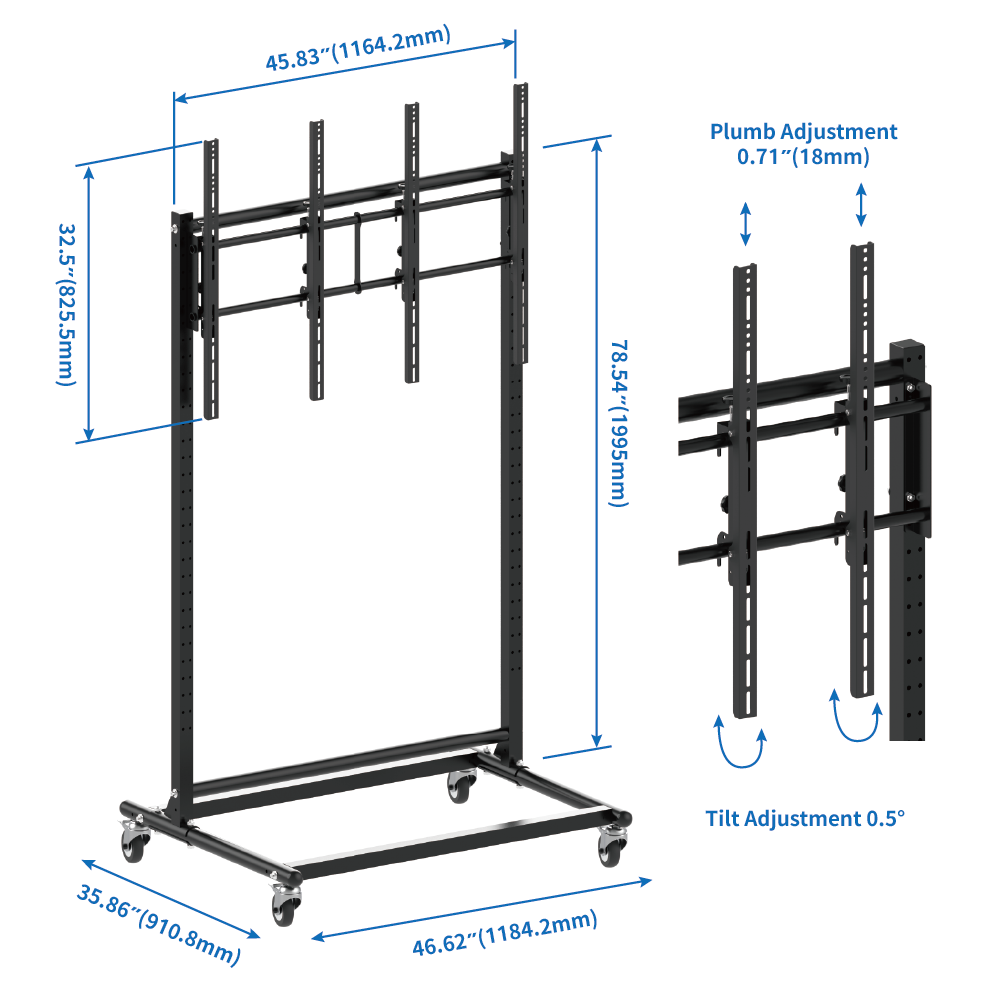 Effortlessly align your display with independent height, plumb, and lateral shift controls for seamless adjustments. The Video Wall Cart is equipped with robust and lockable wheels, ensuring both security and easy maneuverability on various floor types.