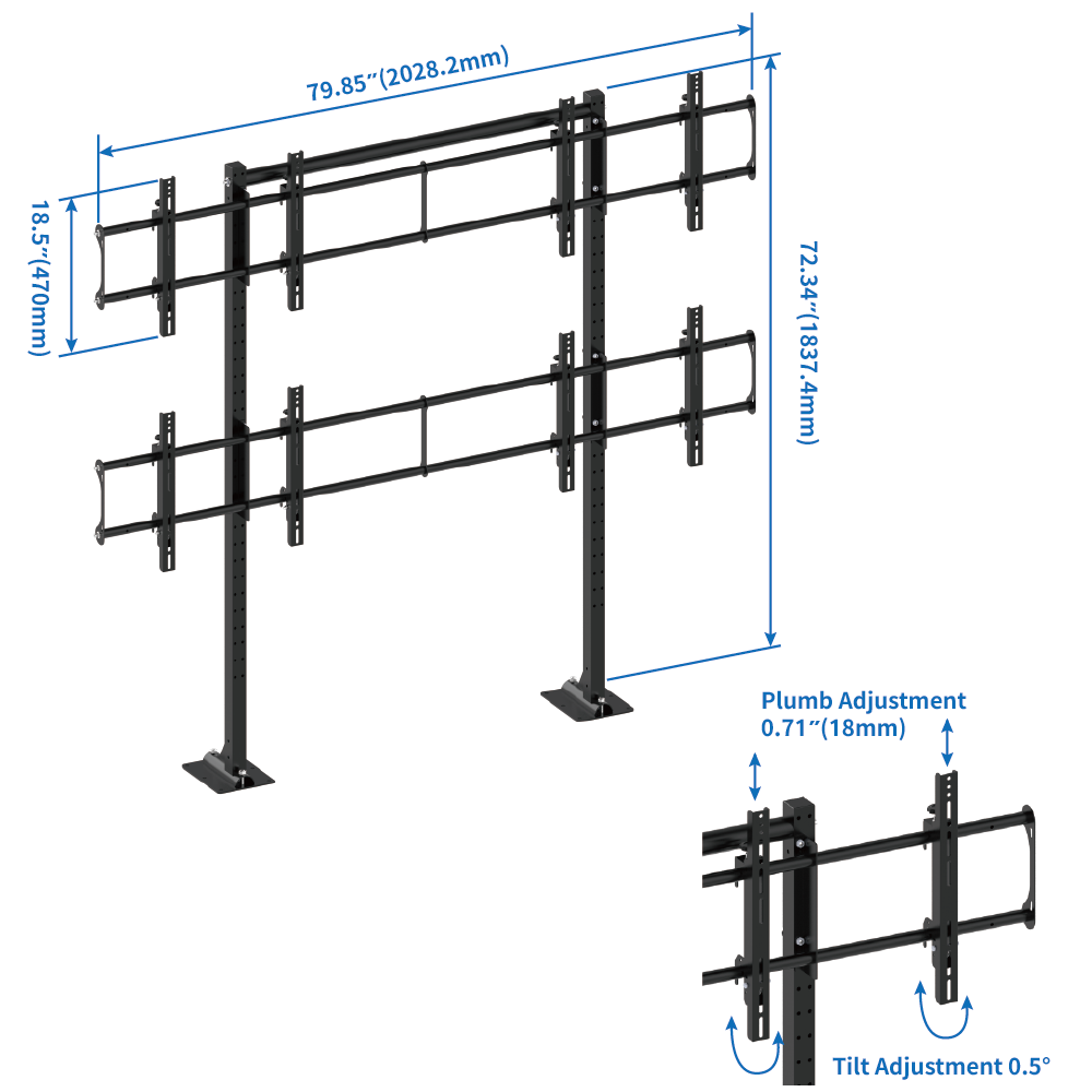 Fine-tune your display with 4 knobs per screen, achieving precise adjustments in vertical, horizontal, and tilt directions for a flawless video wall presentation. The floor is securely bolted for installation, eliminating the need for connections to walls or ceilings. A pre-sorted hardware pack ensures a straightforward installation process.