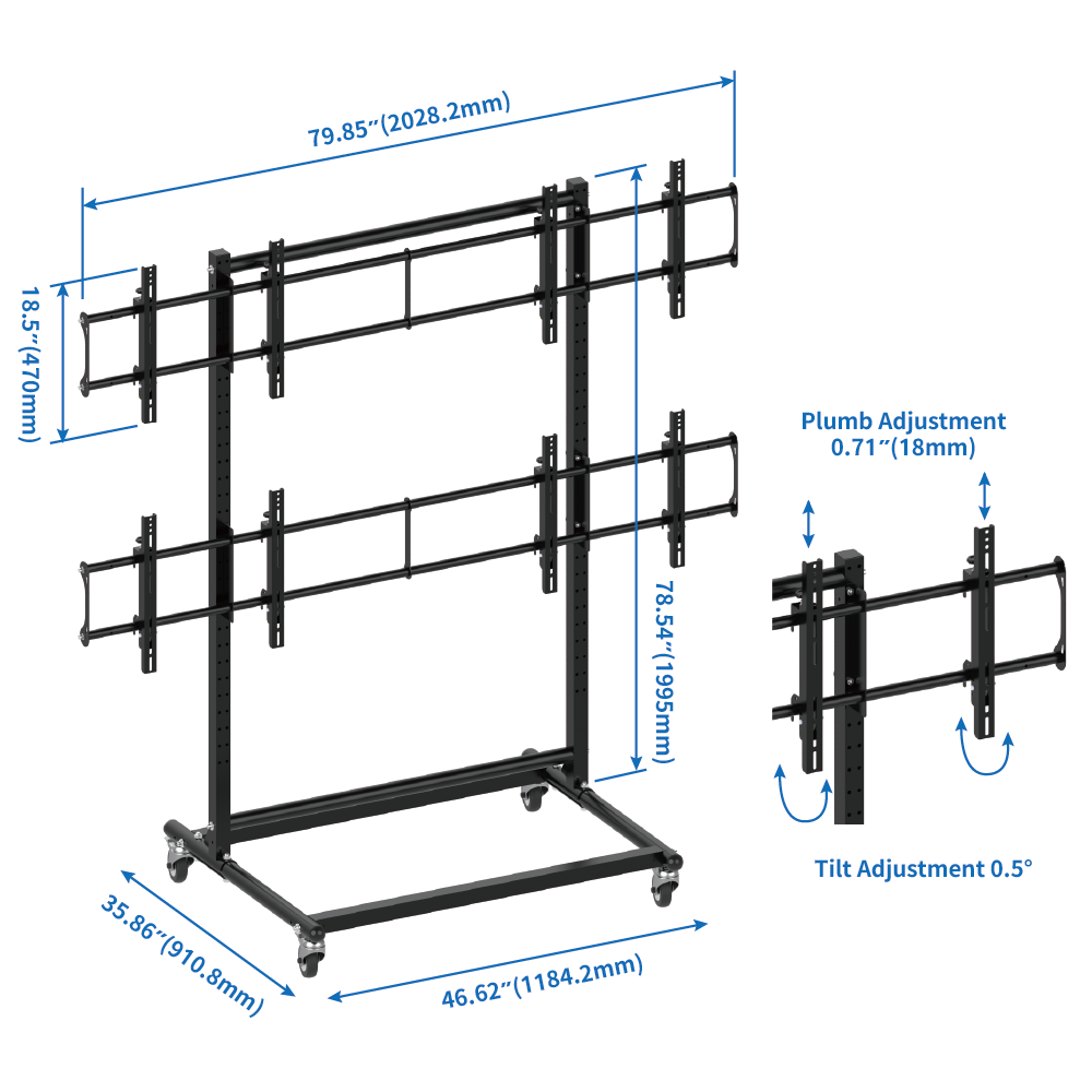 Fine-tune your display with 4 knobs per screen, allowing precise adjustments in vertical, horizontal, and tilt directions for a seamless video wall presentation. The cart is secure and easily movable, featuring robust wheels that can be locked for added stability.