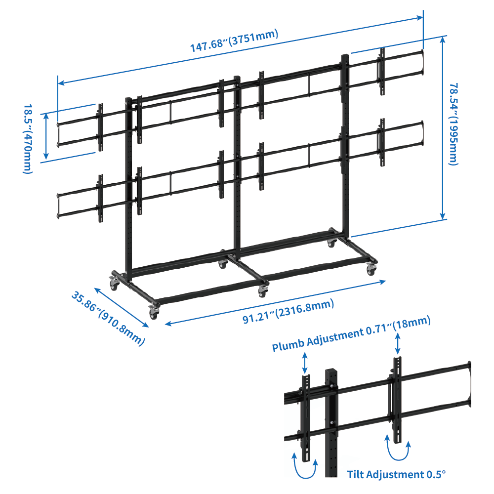 Each screen on the Video Wall Cart is equipped with 4 knobs, offering precise adjustments in vertical, horizontal, and tilt directions. This ensures a seamless and flawless display of your video wall. Whether you're fine-tuning the alignment for a presentation or creating an immersive viewing experience, our cart provides the flexibility you need.