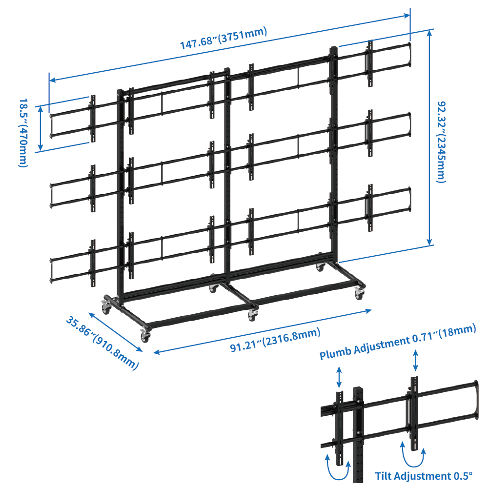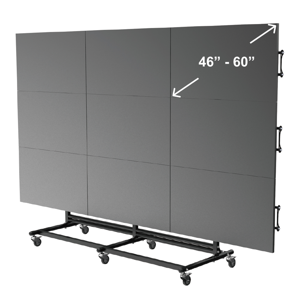 Explore versatile video wall solutions with our 3x3 Configuration, ideal for real-time display of a wealth of information. This configuration is designed to accommodate 46-55 inch screens, adhering to VESA Compatible standards ranging from 200x200 to 600x400. Each screen is equipped with 4 knobs, allowing for precise adjustments in vertical, horizontal, and tilt directions, ensuring a seamless.