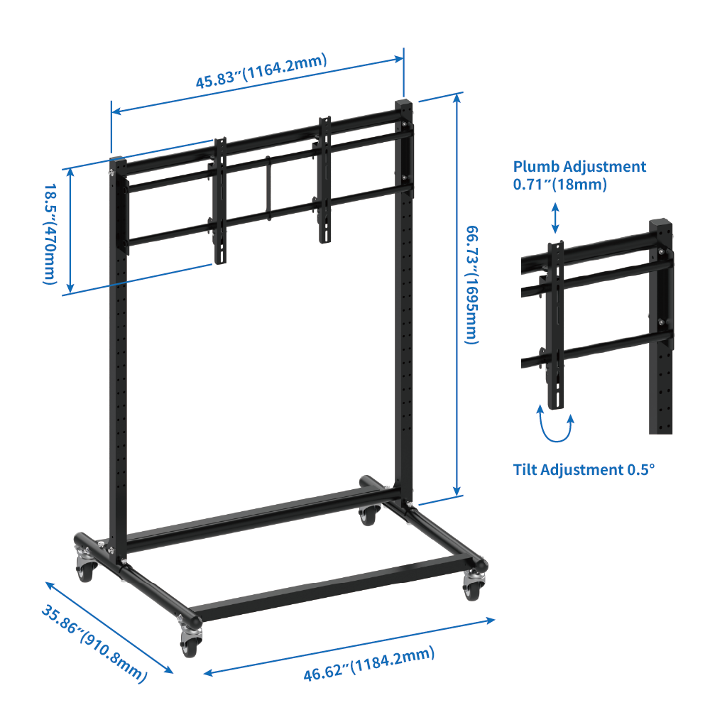 Optional horizontal extension poles can be purchased to expand into 1 x 1, 1 x 2, 1 x 2 vertical and 1 x 3 vertical video wall carts. Equipped with sturdy wheels for smooth, safe movement, it can be locked for stable positioning. The structure of this Mobile TV Cart is made of metal and powder coating to ensure durability and stability for long-term use, and it is easy and fast to install.